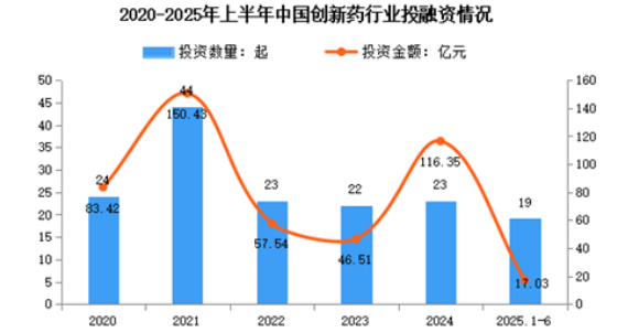 我國創(chuàng)新藥產(chǎn)業(yè)迎來多項突破性進展,推動行業(yè)投融資活躍度提升。IT桔子數(shù)據(jù)顯示,2024年中國已披露創(chuàng)新藥相關(guān)投資事件共23起,融資金額達(dá)116.35億元。2025年上半年,已披露的創(chuàng)新藥相關(guān)投資事件數(shù)量和金額分別達(dá)到19起和17.03億元。