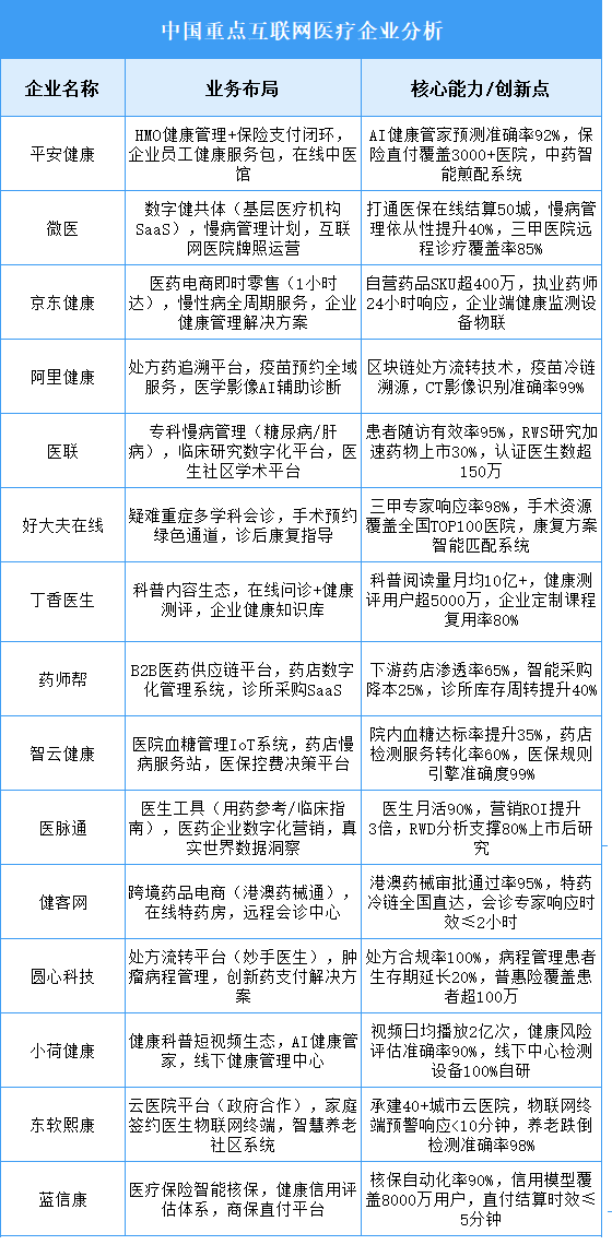 互聯(lián)網(wǎng)醫(yī)療行業(yè)正經(jīng)歷從單一在線問診向“預防-診療-康復”全鏈條數(shù)字化轉型,技術驅動醫(yī)療資源下沉與支付方式創(chuàng)新,政策推動醫(yī)保線上結算與電子處方流轉規(guī)范化。平安健康以“保險+服務”深度融合構建健康管理閉環(huán);微醫(yī)通過數(shù)字醫(yī)療聯(lián)合體賦能基層醫(yī)療機構協(xié)同服務;京東健康依托供應鏈優(yōu)勢打造醫(yī)藥健康一站式生態(tài)。未來行業(yè)將深化遠程醫(yī)療與專病管理結合,探索AI輔助決策與多層次支付體系創(chuàng)新。