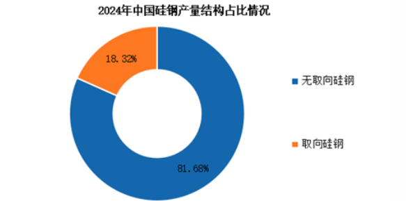 2024年我國硅鋼產(chǎn)量1610萬噸。其中無取向硅鋼產(chǎn)量1315萬噸,占總產(chǎn)量的81.68%,取向硅鋼約占18.32%。