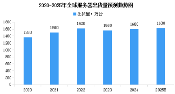 得益于全球數(shù)字化轉(zhuǎn)型的加速和新興技術(shù)的廣泛應(yīng)用,全球服務(wù)器出貨量呈現(xiàn)平穩(wěn)增長態(tài)勢。2020-2024年全球服務(wù)器的出貨量從1360萬臺增長至1600萬臺,年均復(fù)合增長率為4.15%。2025年全球服務(wù)器出貨量將達到1630萬臺。