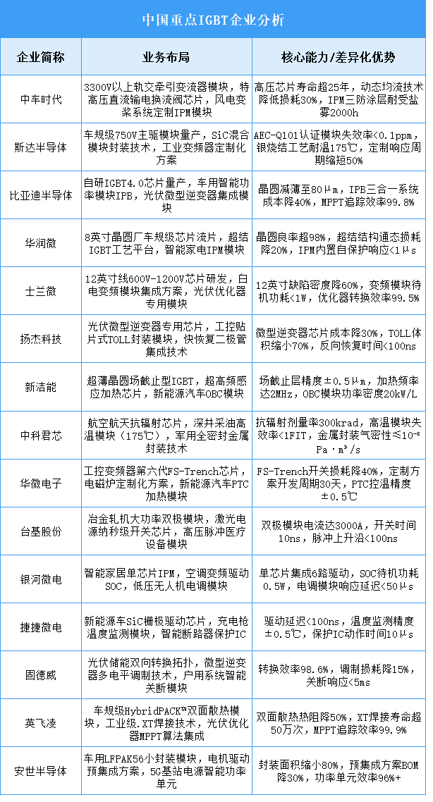 IGBT行業(yè)處于國(guó)產(chǎn)替代加速與碳化硅技術(shù)迭代的關(guān)鍵期,新能源汽車電驅(qū)系統(tǒng)與光伏儲(chǔ)能需求主導(dǎo)市場(chǎng)擴(kuò)容,制造工藝逐步突破高密度溝槽柵與背面減薄技術(shù)瓶頸,產(chǎn)業(yè)鏈向上游晶圓材料及先進(jìn)封裝延伸。中車時(shí)代在軌交電網(wǎng)領(lǐng)域構(gòu)建大功率技術(shù)壁壘;斯達(dá)半導(dǎo)體聚焦車規(guī)級(jí)模塊封裝可靠性;比亞迪半導(dǎo)體依托整車廠需求閉環(huán)推進(jìn)垂直整合模式。