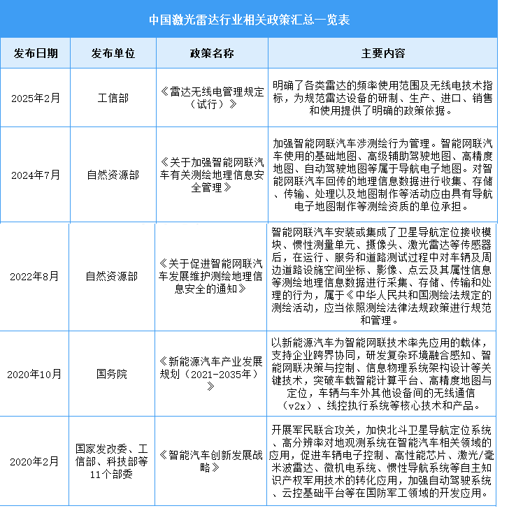 近年來,為了促進激光雷達行業(yè)的發(fā)展,中國政府及相關(guān)部門出臺了一系列相關(guān)政策。這些政策不僅推動了激光雷達技術(shù)的創(chuàng)新和產(chǎn)業(yè)升級,還促進了市場應(yīng)用和需求的增長,為激光雷達行業(yè)的未來發(fā)展奠定了堅實基礎(chǔ)。