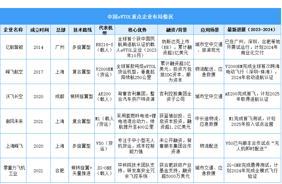 中國eVTOL企業(yè)呈現(xiàn)多元化競爭格局,億航智能、沃飛長空、沃蘭特航空、小鵬匯天、峰飛航空等頭部企業(yè)通過技術(shù)差異化(傾轉(zhuǎn)旋翼/復(fù)合翼)和場景深耕(載人/物流)搶占市場先機(jī)。從區(qū)域發(fā)展情況來看,依托區(qū)域航空產(chǎn)業(yè)鏈和資本優(yōu)勢,中國eVTOL企業(yè)主要聚集在長三角(上海、合肥)和珠三角(廣州、深圳)。