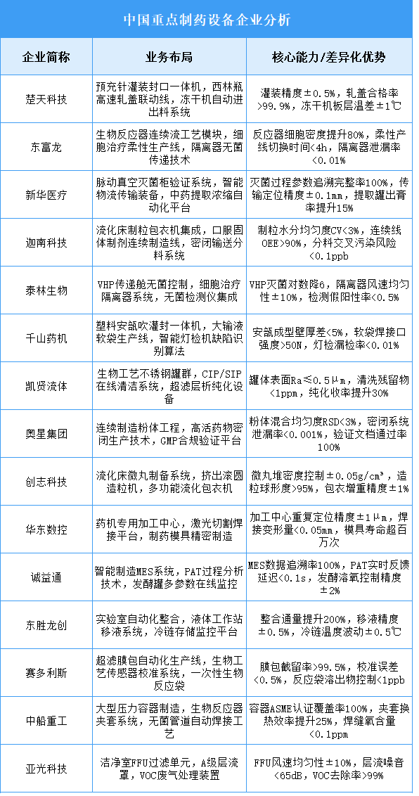 行業(yè)正加速向智能化、模塊化、連續(xù)化制造升級,生物藥產(chǎn)能擴(kuò)張驅(qū)動高密閉性生產(chǎn)系統(tǒng)需求激增,模塊化工廠設(shè)計與一次性技術(shù)深度應(yīng)用成為創(chuàng)新方向,國產(chǎn)企業(yè)逐步突破高端無菌制劑裝備與細(xì)胞治療設(shè)備技術(shù)壁壘。楚天科技在無菌分裝聯(lián)動線領(lǐng)域?qū)崿F(xiàn)進(jìn)口替代;東富龍聚焦生物反應(yīng)器及凍干系統(tǒng)集成;新華醫(yī)療深耕消毒滅菌設(shè)備與院內(nèi)制劑解決方案。