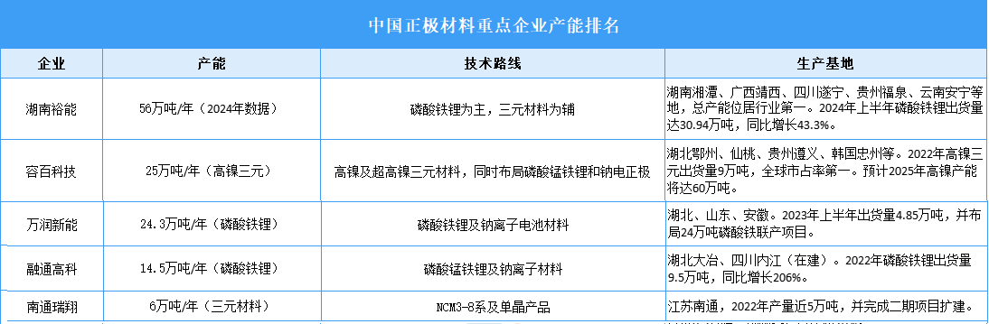 國內(nèi)正極材料企業(yè)已具備全球競爭力,市場集中度相對較高,磷酸鐵鋰材料重點企業(yè)包括湖南裕能、德方納米、萬潤能源、融通高科等,三元材料重點企業(yè)包括容百科技、天津巴莫、廈鎢新能、南通瑞翔等。