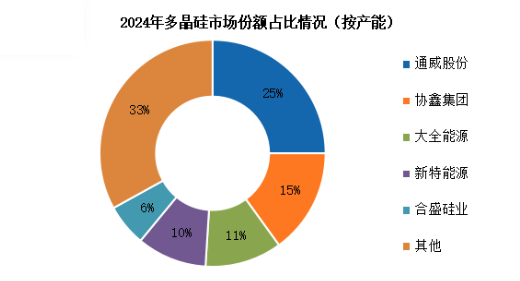 目前,多晶硅行業(yè)集中度高,2024年前五企業(yè)市場(chǎng)份額占比接近70%。其中,通威股份排名第一,產(chǎn)能占比達(dá)25%。其次分別為協(xié)鑫集團(tuán)、大全能源、新特能源、合盛硅業(yè),產(chǎn)能分別占比15%、11%、10%、6%。