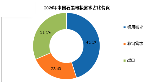 2024年石墨電極總需求為92萬噸,其中鋼用需求為41.5萬噸,占比達(dá)45.1%。非鋼需求21.5萬噸,占比達(dá)23.4%。出口約為29萬噸。