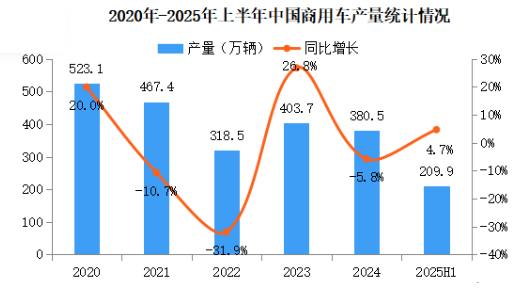 2025年6月,商用車產(chǎn)銷分別完成35.4萬輛和36.9萬輛,環(huán)比分別增長5.3%和10.3%,同比分別增長7.1%和9.5%。2025年1-6月,商用車產(chǎn)銷分別完成209.9萬輛和212.2萬輛,同比分別增長4.7%和2.6%。