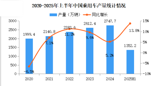 2025年6月,乘用車(chē)產(chǎn)銷(xiāo)分別完成244.1萬(wàn)輛和253.6萬(wàn)輛,環(huán)比分別增長(zhǎng)5.5%和7.8%,同比分別增長(zhǎng)12.1%和14.5%。2025年1-6月,乘用車(chē)產(chǎn)銷(xiāo)分別完成1352.2萬(wàn)輛和1353.1萬(wàn)輛,同比分別增長(zhǎng)13.8%和13%。