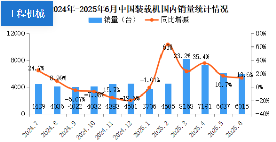 2025年6月銷售各類裝載機(jī)12014臺(tái),同比增長(zhǎng)11.3%。其中國(guó)內(nèi)銷量6015臺(tái),同比增長(zhǎng)13.6%;出口量5999臺(tái),同比增長(zhǎng)9.11%。