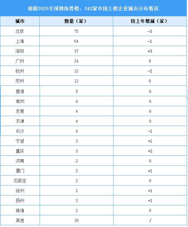 胡潤研究院發(fā)布《2025全球獨(dú)角獸榜》,列出了成立于2000年之后、價(jià)值10億美元以上的非上市公司。榜單顯示,全球獨(dú)角獸企業(yè)數(shù)量達(dá)1523家,比去年增加70家,分布在52個(gè)國家的307個(gè)城市。其中,美國以758家獨(dú)角獸企業(yè)領(lǐng)先,增加了55家;中國以343家獨(dú)角獸企業(yè)位居第二,增加了3家。北京、上海、深圳、廣州和杭州分列國內(nèi)城市數(shù)量前五,深圳、合肥、重慶成為國內(nèi)獨(dú)角獸企業(yè)增長最快的城市。