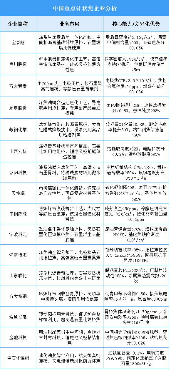 針狀焦行業(yè)伴隨鋰電池負極材料與超高功率電極需求爆發(fā)進入擴產高峰,油系針狀焦突破高端負極焦取向控制技術,煤系產品加速高純度低硫路線迭代,企業(yè)圍繞原料穩(wěn)定性、能耗控制及高端產品一致性展開競爭。寶泰隆以煤焦油深加工貫通煤系焦全鏈條;百川股份聚焦鋰電池高端負極焦定向生長;方大炭素主導大規(guī)格超高功率石墨電極用焦市場。