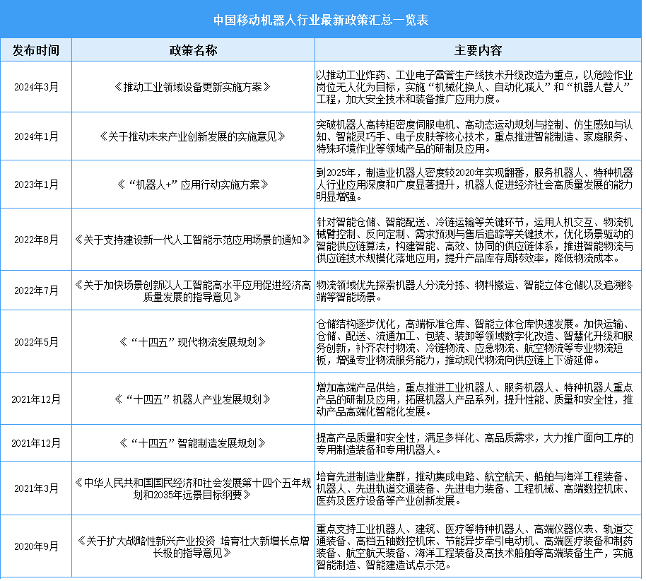 為推動移動機器人產(chǎn)業(yè)發(fā)展,我國政府相關(guān)部門發(fā)布了《推動工業(yè)領(lǐng)域設(shè)備更新實施方案》《“機器人+”應(yīng)用行動實施方案》《關(guān)于支持建設(shè)新一代人工智能示范應(yīng)用場景的通知》《“十四五”機器人產(chǎn)業(yè)發(fā)展規(guī)劃》《“十四五”智能制造發(fā)展規(guī)劃》等一系列政策文件,從技術(shù)研發(fā)、應(yīng)用場景拓展等多方面給予支持。