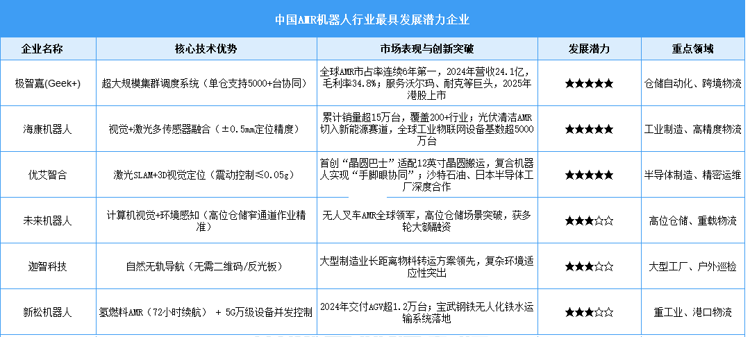 AMR(自主移動機器人)是一類具備高度自主導(dǎo)航和決策能力的機器人,能夠在復(fù)雜環(huán)境中實時感知、規(guī)劃路徑并執(zhí)行任務(wù),無需依賴預(yù)設(shè)的固定路徑或外部引導(dǎo)。AMR憑借其自主導(dǎo)航、智能決策和跨場景適應(yīng)性,正從“工具型設(shè)備”進化為“智能協(xié)作系統(tǒng)”。在人口紅利消退與產(chǎn)業(yè)升級的雙重驅(qū)動下,AMR將成為企業(yè)數(shù)字化轉(zhuǎn)型的核心引擎。以下是基于技術(shù)創(chuàng)新、場景落地能力、資本熱度及全球化布局綜合評估的中國AMR行業(yè)最具發(fā)展?jié)摿ζ髽I(yè)表格,涵蓋工業(yè)物流、倉儲、半導(dǎo)體等高增長領(lǐng)域: