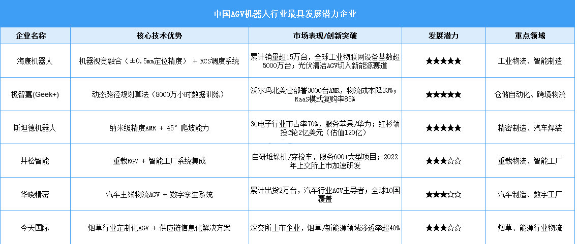AGV即自動導(dǎo)引運輸車,是一種裝備電磁或光學(xué)等自動導(dǎo)引裝置,沿預(yù)設(shè)路徑行駛,具備安全保護及移載功能的輪式移動機器人。AGV機器人正從單一搬運工具進化為智能制造生態(tài)系統(tǒng)的基礎(chǔ)單元。未來隨著復(fù)合機器人(AMR+機械臂)占比升至35%,AGV將深度融入工業(yè)軟件、數(shù)字孿生等領(lǐng)域,形成“硬件+軟件+服務(wù)”的一體化解決方案。以下是基于行業(yè)影響力、技術(shù)儲備、創(chuàng)新潛力及市場表現(xiàn)綜合評估的中國AGV機器人行業(yè)最具發(fā)展?jié)摿ζ髽I(yè)表格,涵蓋工業(yè)物流、倉儲及新興應(yīng)用領(lǐng)域: