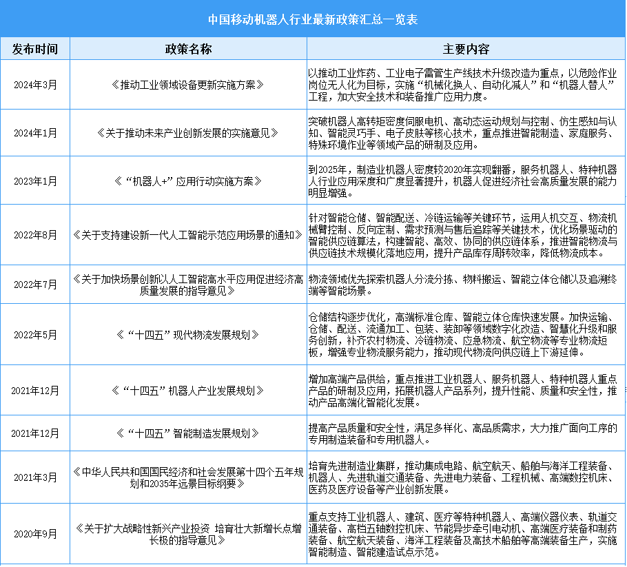 為推動(dòng)移動(dòng)機(jī)器人產(chǎn)業(yè)發(fā)展,我國政府相關(guān)部門發(fā)布了《推動(dòng)工業(yè)領(lǐng)域設(shè)備更新實(shí)施方案》《“機(jī)器人+”應(yīng)用行動(dòng)實(shí)施方案》《關(guān)于支持建設(shè)新一代人工智能示范應(yīng)用場(chǎng)景的通知》《“十四五”機(jī)器人產(chǎn)業(yè)發(fā)展規(guī)劃》《“十四五”智能制造發(fā)展規(guī)劃》等一系列政策文件,從技術(shù)研發(fā)、應(yīng)用場(chǎng)景拓展等多方面給予支持。