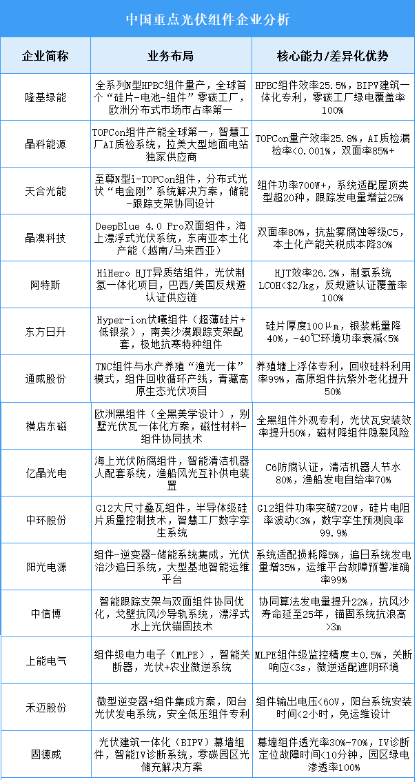 光伏組件行業(yè)加速向N型技術(shù)迭代,TOPCon/HJT/鈣鈦礦疊層技術(shù)競爭白熱化,龍頭企業(yè)推進(jìn)垂直一體化產(chǎn)能與海外本土化布局,雙面組件、輕量化及智能跟蹤系統(tǒng)成為差異化競爭焦點(diǎn)。隆基綠能憑借全場景產(chǎn)品矩陣覆蓋全球市場;晶科能源以TOPCon量產(chǎn)效率領(lǐng)跑技術(shù)升級(jí);天合光能依托分布式系統(tǒng)集成能力構(gòu)建戶用壁壘。