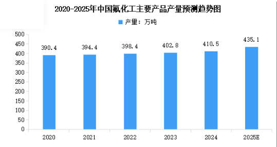 得益于豐富的螢石資源,我國氟化工產(chǎn)業(yè)規(guī)?焖賶汛,產(chǎn)業(yè)布局日趨完善。目前我國有氟化工企業(yè)上千家,形成了完整的氟化工產(chǎn)業(yè)鏈。2024年中國氟化工主要產(chǎn)品產(chǎn)量達到約410.5萬噸,較上年增長1.2%。2025年中國氟化工主要產(chǎn)品產(chǎn)量將達到435.1萬噸。