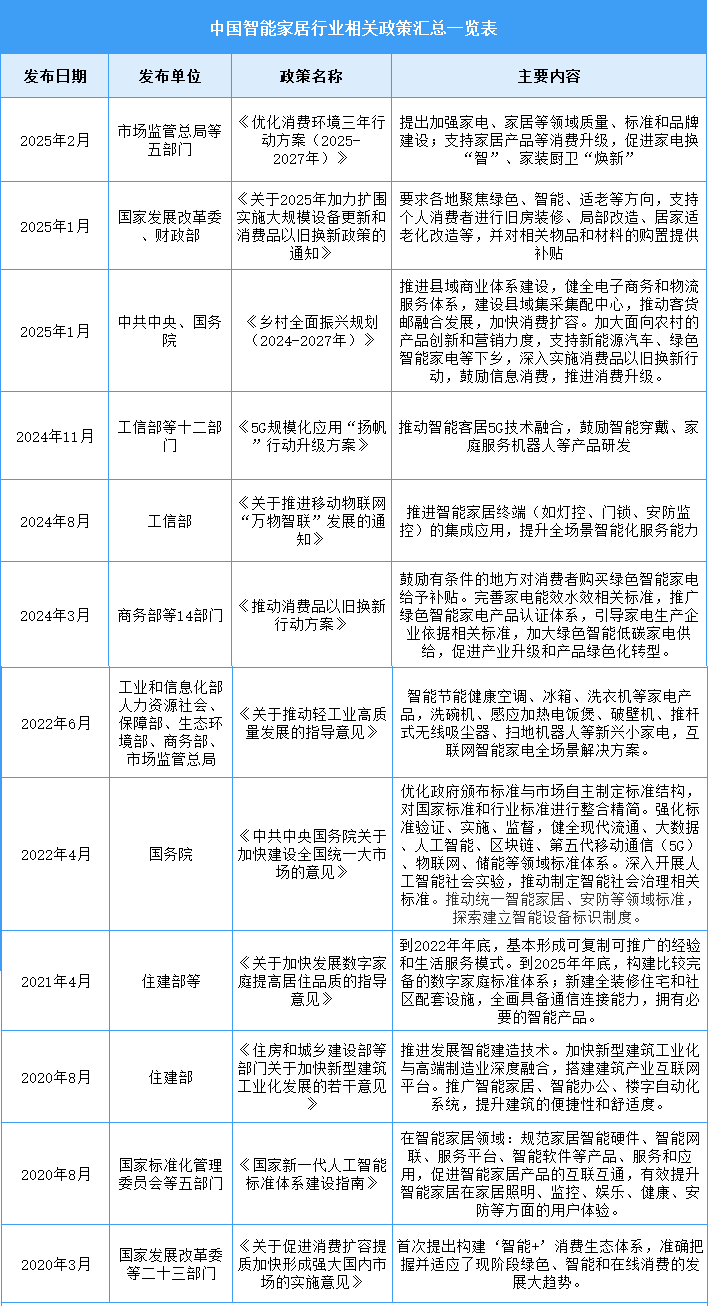 近年來,中國智能家居行業(yè)受到各級(jí)政府的高度重視和國家產(chǎn)業(yè)政策的重點(diǎn)支持。國家陸續(xù)出臺(tái)了多項(xiàng)政策,鼓勵(lì)智能家居行業(yè)發(fā)展與創(chuàng)新,《優(yōu)化消費(fèi)環(huán)境三年行動(dòng)方案(2025-2027年)》《5G規(guī);瘧(yīng)用“揚(yáng)帆”行動(dòng)升級(jí)方案》《關(guān)于推進(jìn)移動(dòng)物聯(lián)網(wǎng)“萬物智聯(lián)”發(fā)展的通知》等產(chǎn)業(yè)政策為智能家居行業(yè)的發(fā)展提供了明確、廣闊的市場(chǎng)前景,為企業(yè)提供了良好的生產(chǎn)經(jīng)營環(huán)境。具體情況列示如下: