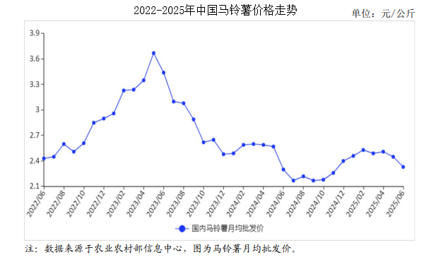 2025年6月,馬鈴薯價(jià)格延續(xù)下跌趨勢(shì)。在采收范圍進(jìn)一步擴(kuò)大和團(tuán)體消費(fèi)減少等因素共同作用下,馬鈴薯市場(chǎng)價(jià)格延續(xù)下跌趨勢(shì)的可能性較大。