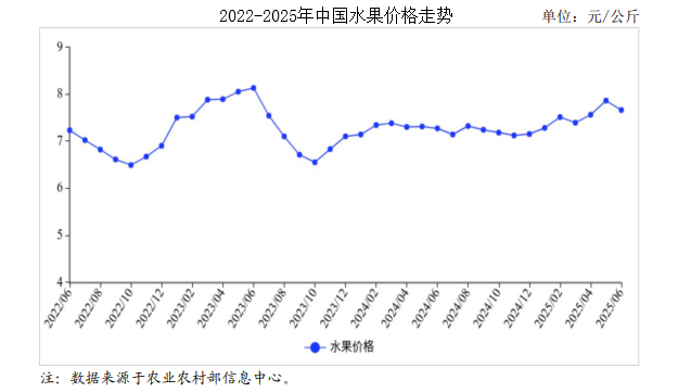 2025年6月,水果批發(fā)價格環(huán)比下跌。隨著西瓜、葡萄等時令水果供應(yīng)量持續(xù)加大,疊加新季早熟梨果上市,水果市場供給充足,價格總體季節(jié)性下跌。
