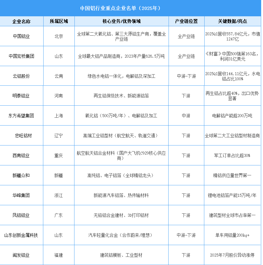 鋁行業(yè)重點企業(yè)眾多,中國鋁業(yè)、中國宏橋、云鋁股份等國內(nèi)企業(yè)憑借規(guī)模與技術(shù)優(yōu)勢占據(jù)重要地位,俄鋁、力拓等海外企業(yè)也在全球市場發(fā)揮關(guān)鍵作用。