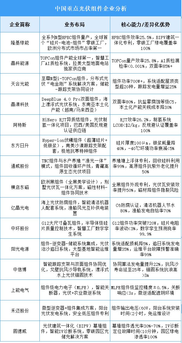 光伏組件行業(yè)加速向N型技術(shù)迭代,TOPCon/HJT/鈣鈦礦疊層技術(shù)競(jìng)爭(zhēng)白熱化,龍頭企業(yè)推進(jìn)垂直一體化產(chǎn)能與海外本土化布局,雙面組件、輕量化及智能跟蹤系統(tǒng)成為差異化競(jìng)爭(zhēng)焦點(diǎn)。隆基綠能憑借全場(chǎng)景產(chǎn)品矩陣覆蓋全球市場(chǎng);晶科能源以TOPCon量產(chǎn)效率領(lǐng)跑技術(shù)升級(jí);天合光能依托分布式系統(tǒng)集成能力構(gòu)建戶用壁壘。