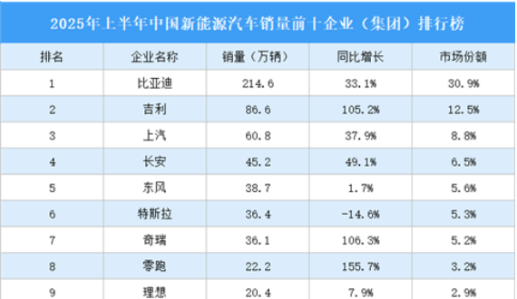 上半年,新能源汽車銷量排名前十位的集團銷量合計為580.7萬輛,占新能源汽車銷售總量的83.7%。其中,比亞迪銷量最高達214.6萬輛,市場份額30.9%。吉利、上汽排名第二和第三,銷量分別為86.6萬輛、60.8萬輛,市場份額12.5%、8.8%。長安、東風、特斯拉、奇瑞、零跑、理想、小鵬進入前十,依次排名第4-10名。