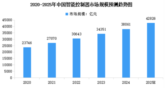 我國智能控制器行業(yè)起步較晚,但近年來發(fā)展迅速。中國電子信息產(chǎn)業(yè)的快速發(fā)展為智能控制器行業(yè)提供了良好的技術(shù)基礎(chǔ),加之國內(nèi)企業(yè)擁有產(chǎn)業(yè)集群優(yōu)勢(shì)并重視生產(chǎn)自動(dòng)化,生產(chǎn)制造成本相對(duì)較低,越來越多的國外知名終端廠商在中國落戶并與國內(nèi)企業(yè)建立合作關(guān)系,為國內(nèi)智能控制器行業(yè)的發(fā)展提供了良好的市場(chǎng)機(jī)遇。2024年中國智能控制器市場(chǎng)規(guī)模約38061億元,近五年年均復(fù)合增長率達(dá)12.5%。2025年中國智能控制器市場(chǎng)規(guī)模將達(dá)到42826億元。