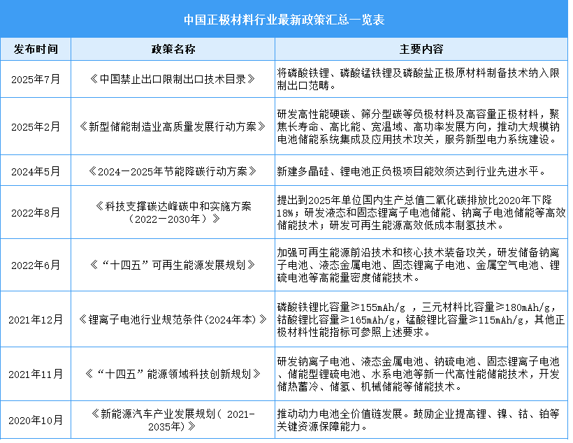 我國十分重視正極材料產(chǎn)業(yè)的發(fā)展,出臺了一系列政策舉措,為正極材料產(chǎn)業(yè)的發(fā)展提供了有力的政策保障。2025年,《中國禁止出口限制出口技術(shù)目錄》將磷酸鐵鋰、磷酸錳鐵鋰等正極材料制備技術(shù)納入限制出口范圍,同時出臺多項(xiàng)政策推動行業(yè)技術(shù)升級與綠色轉(zhuǎn)型,如《2024-2025年節(jié)能降碳行動方案》嚴(yán)格新增產(chǎn)能準(zhǔn)入,《鋰離子電池行業(yè)規(guī)范條件(2024年本)》強(qiáng)化碳足跡核算與資源回收,引導(dǎo)行業(yè)向高技術(shù)、高安全、低碳化方向發(fā)展。