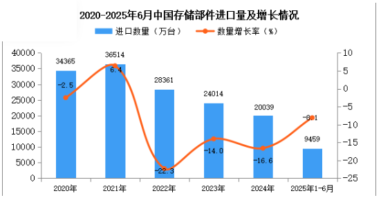 2024年中國(guó)存儲(chǔ)部件進(jìn)口量20039萬(wàn)臺(tái),同比下降16.6%。最新數(shù)據(jù)顯示,2025年1-6月中國(guó)存儲(chǔ)部件進(jìn)口量9459萬(wàn)臺(tái),同比下降8.1%。