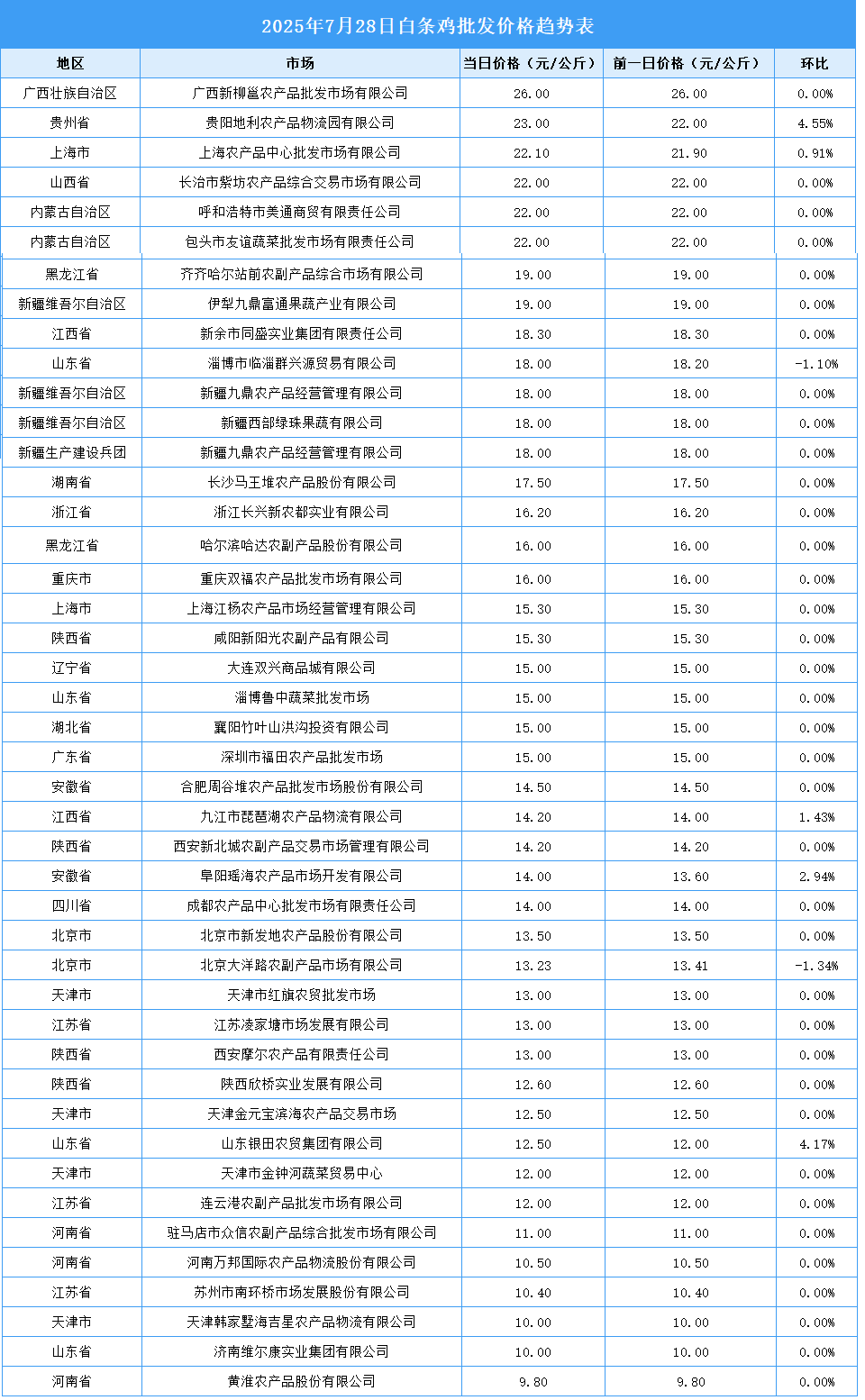 7月28日全國白條雞平均價格為16.16元/公斤。其中,白條雞價格最高的市場是廣西新柳邕農(nóng)產(chǎn)品批發(fā)市場有限公司,當(dāng)日價格為26.00元/公斤,環(huán)比持平。白條雞價格最低的市場是黃淮農(nóng)產(chǎn)品股份有限公司,當(dāng)日價格為9.80元/公斤,環(huán)比持平。