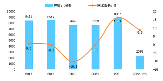 2021年,我國(guó)全年豬牛羊禽肉產(chǎn)量8887萬(wàn)噸,比上年增長(zhǎng)16.3%。2022年一季度全國(guó)畜牧業(yè)生產(chǎn)穩(wěn)步發(fā)展,全國(guó)豬牛羊禽肉產(chǎn)量2395萬(wàn)噸,比上年同期增加194萬(wàn)噸,增長(zhǎng)8.8%。其中,生豬出欄繼續(xù)增長(zhǎng);牛羊生產(chǎn)穩(wěn)定發(fā)展;禽肉產(chǎn)量減少,禽蛋產(chǎn)量增加。