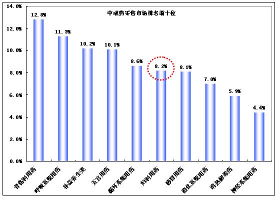 圖表 2008年我國中成藥零售市場銷售額前十位排名