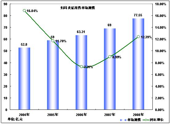 由于婦科炎癥屬于常見、多發(fā)病,其臨床表現(xiàn)多種多樣,病因復雜且常伴有多種嚴重并發(fā)癥的特點,因此,其市場需求較大。隨著社會經(jīng)濟和文化的發(fā)展以及女性自我保健意識的增強,婦科炎癥用藥市場近年來增長很快,每年以兩位數(shù)的增速上升,2007年已創(chuàng)下了69億元的新高。預計2008年婦科炎癥用藥市場規(guī)模將會高達77.55億元。并且這一市場以每年10~15%的速度增長。到2010年,市場規(guī)模將突破90億元。